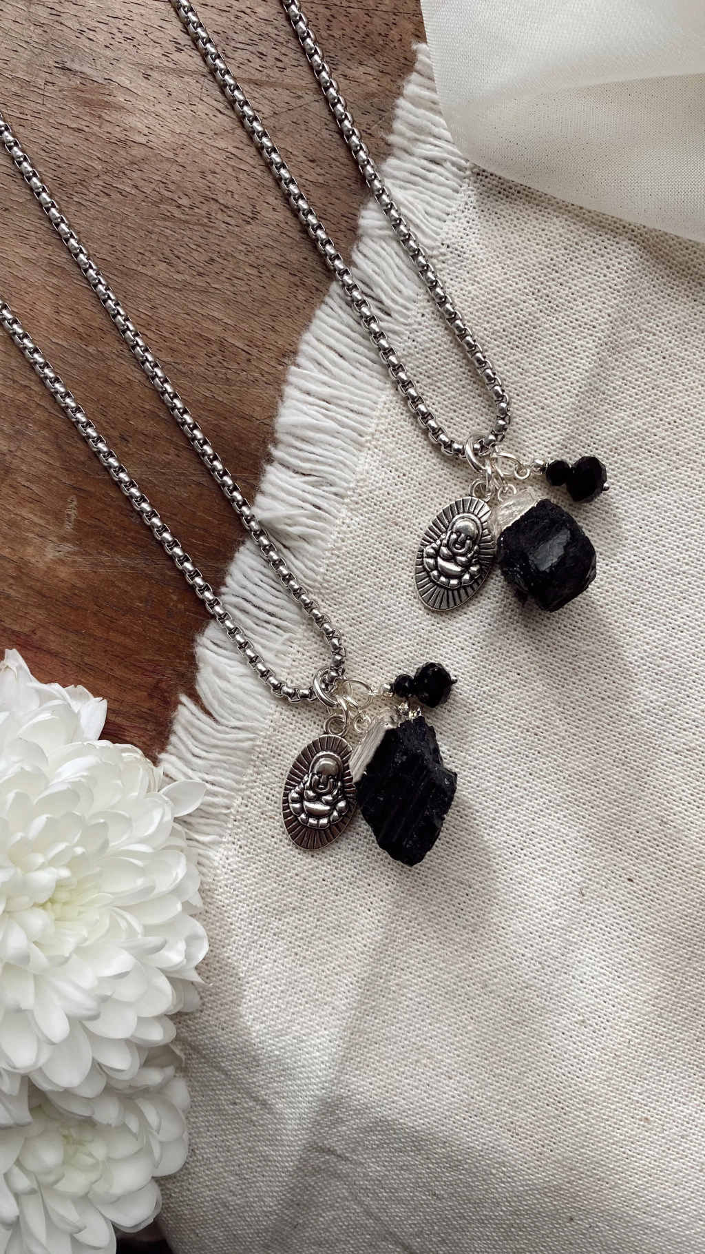 Este collar esta realizado con Cadena de acero quirúrgico, apliques y dijes de fundición. Combinamos este amuleto con una Turmalina con baño de plata.