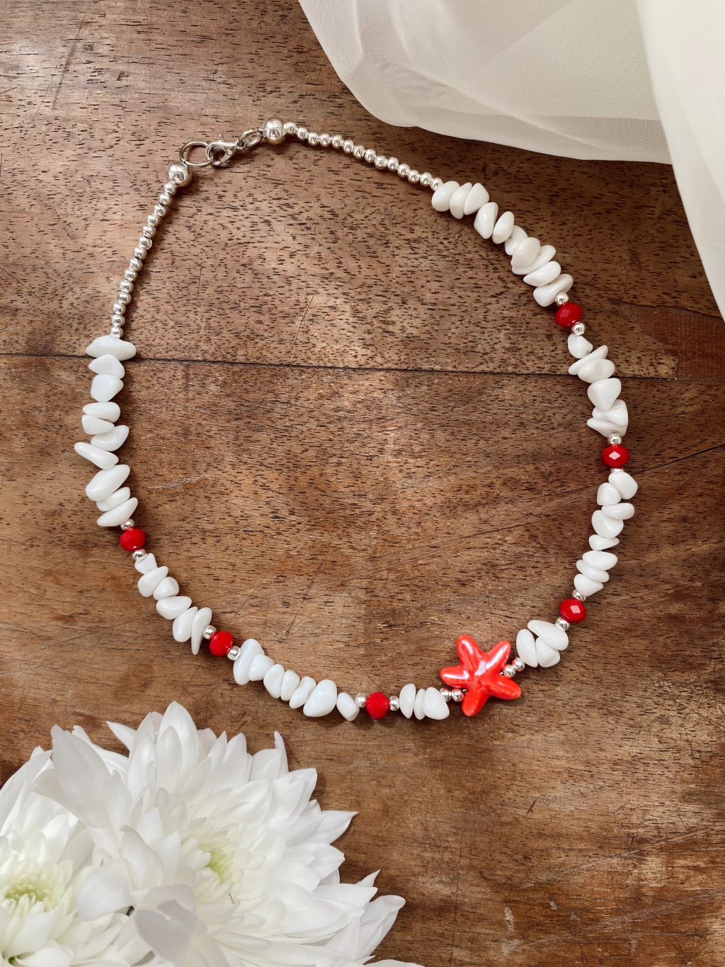 Para las que aman sumar color a sus outfits veraniegos pensé en este collar con dije de estrella de mar de cerámica combinado con escallas de Ónix Blanco, este cristal representa la pureza, la luz y la verdad, además está ligado al Chakra coronario, que se ubica en la parte superior de la cabeza, y se asocia con la conexión espiritual y con ma energía universal. Muchas culturas lo usaban como amuleto contra el mal de ojo.