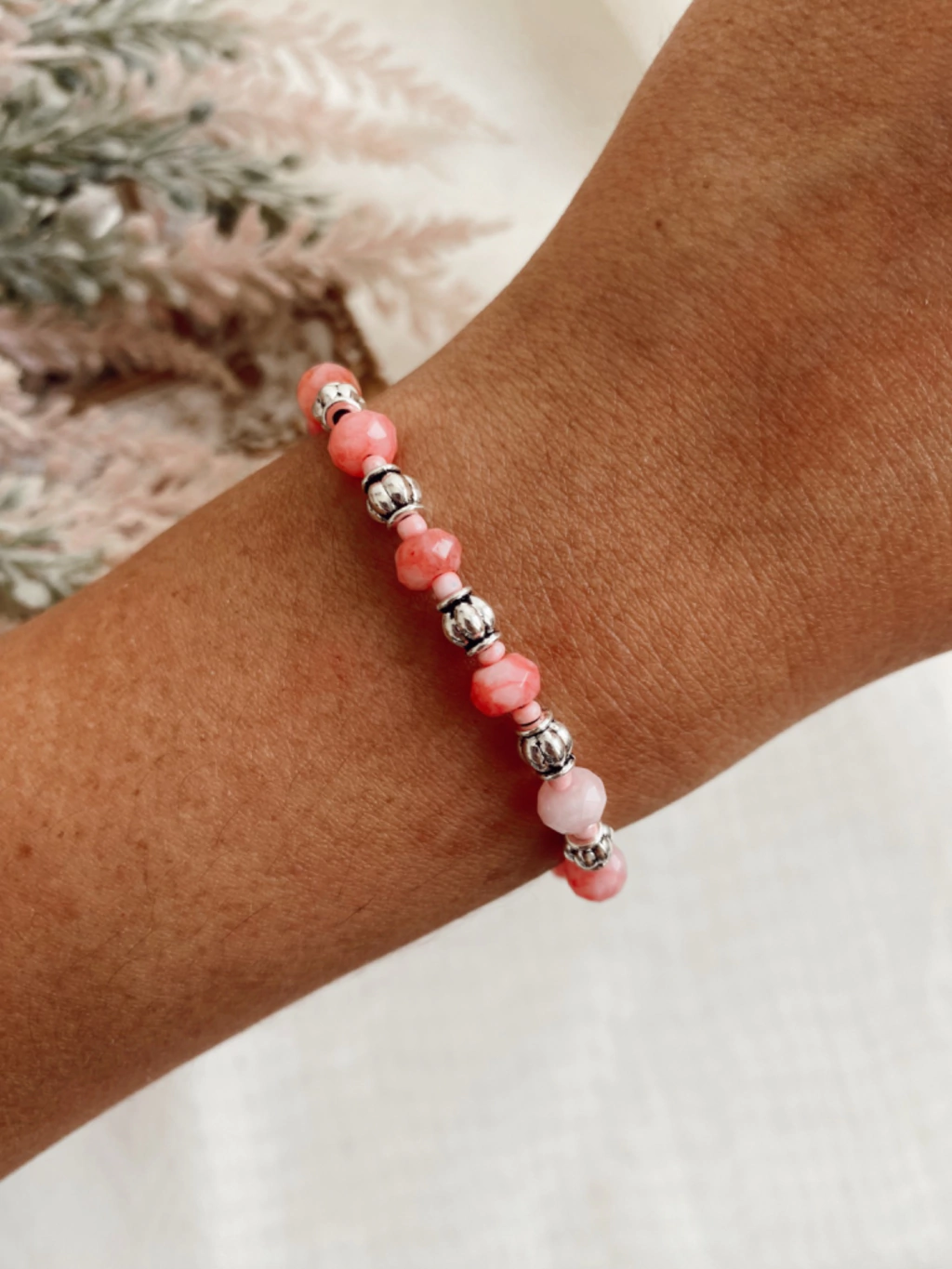 Pulsera realizada con tanza de acero rígida de 16 cm de largo. Cuentas de ágata teñida, bolitas y separadores de fundición. En el extremo le colocamos un dije de piedra natural de cuarzo rosa y una medalla doble faz de San Benito en fundición.