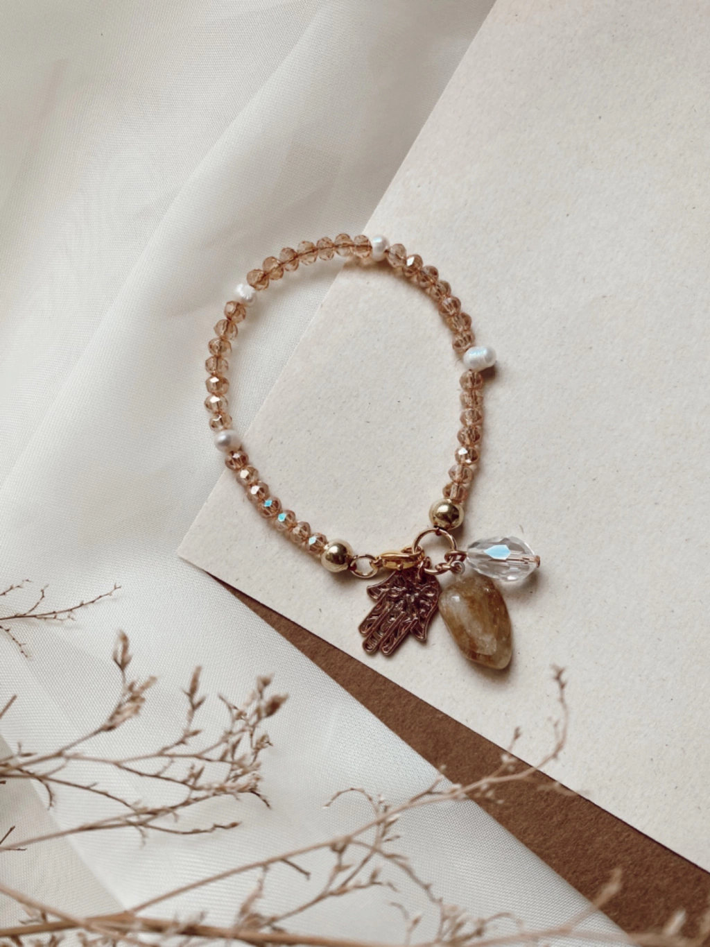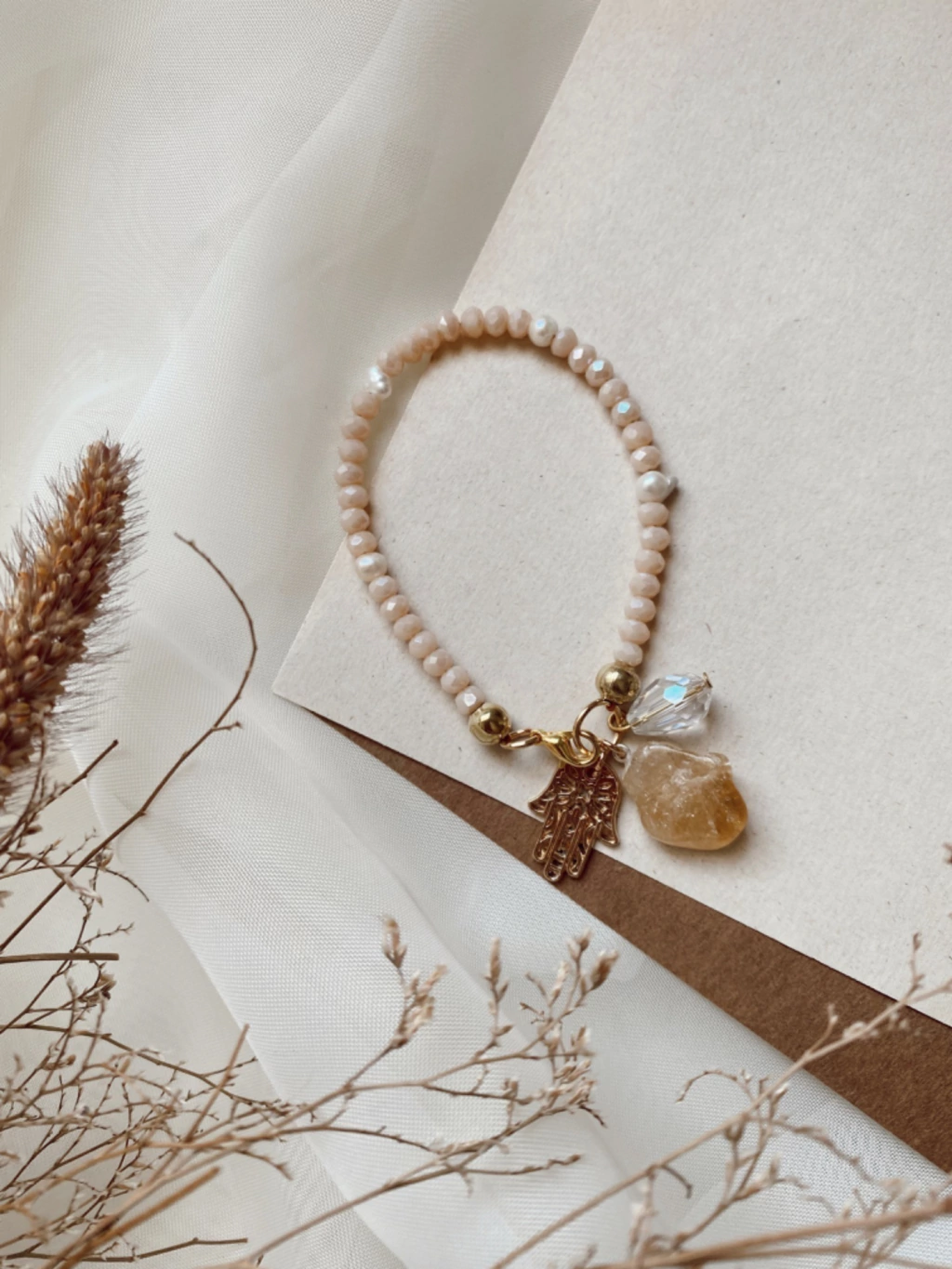 Pulsera de tanza rígida con cristales acrílicos más perlas de río naturales, dijes de fundicion y piedra natural citrino. Medida: 17cm