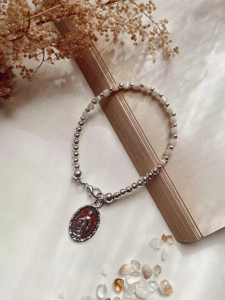 Pulsera hecha con tanza rígida, cuentas de metal niquelado y acrílicas en forma de cubitos. Le colocamos una hermosa medalla doble de fundición con la imagen de la Virgen de la medalla Milagrosa.