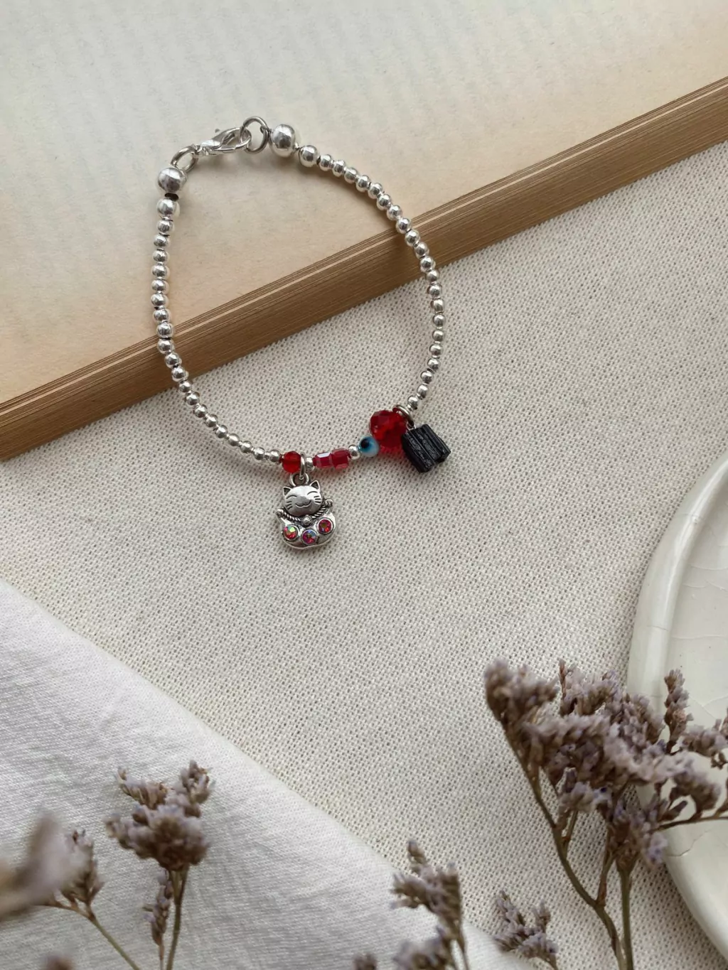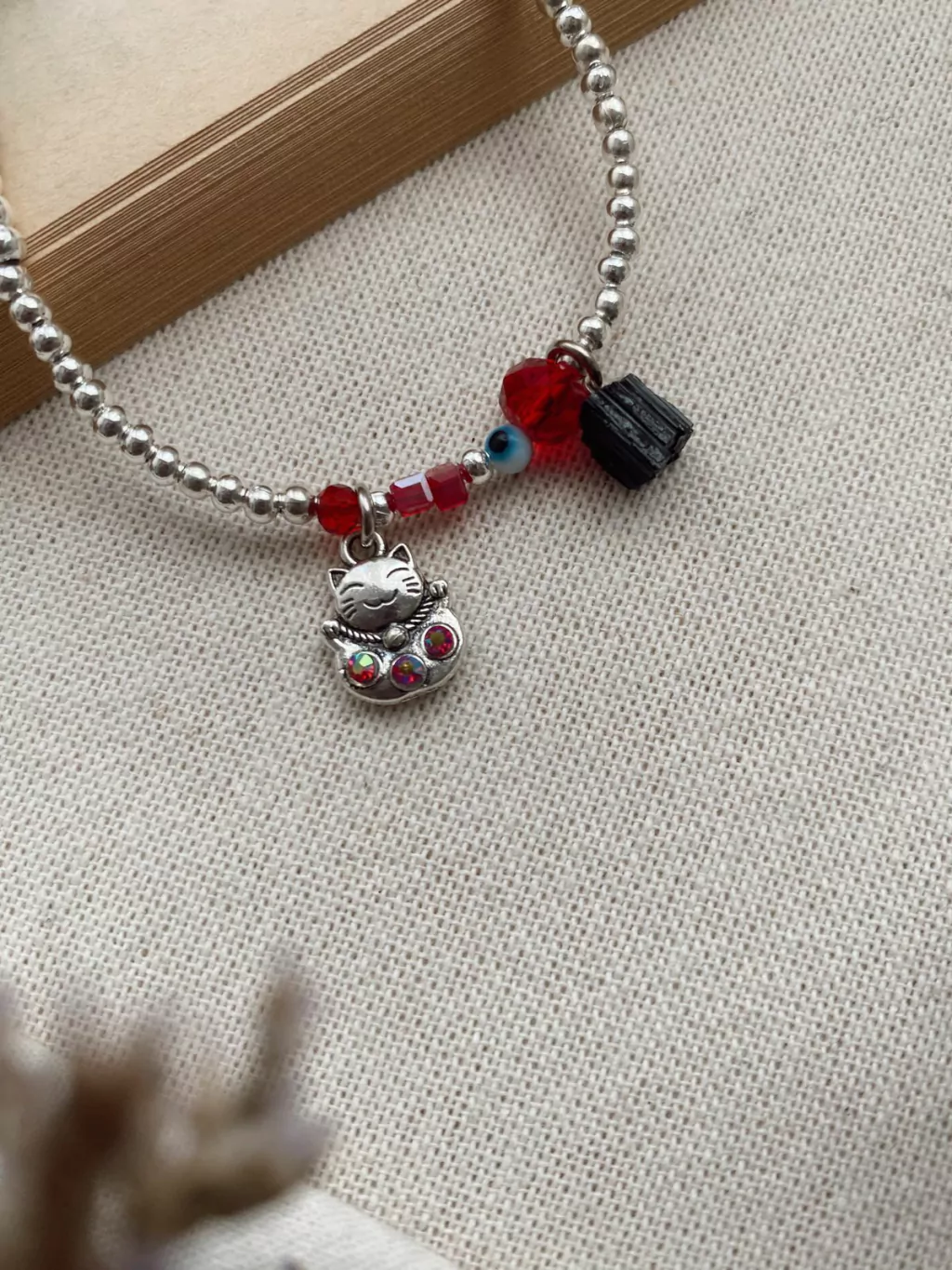 Pulsera de tanza rígida, realizada con bolitas de metal Niquelado, cristeales acrílicos en tonos rojos, dije de gatito de la suerte Maneki Neko con cristales, ojito turco de vidrio y mini Turmalina Natural.