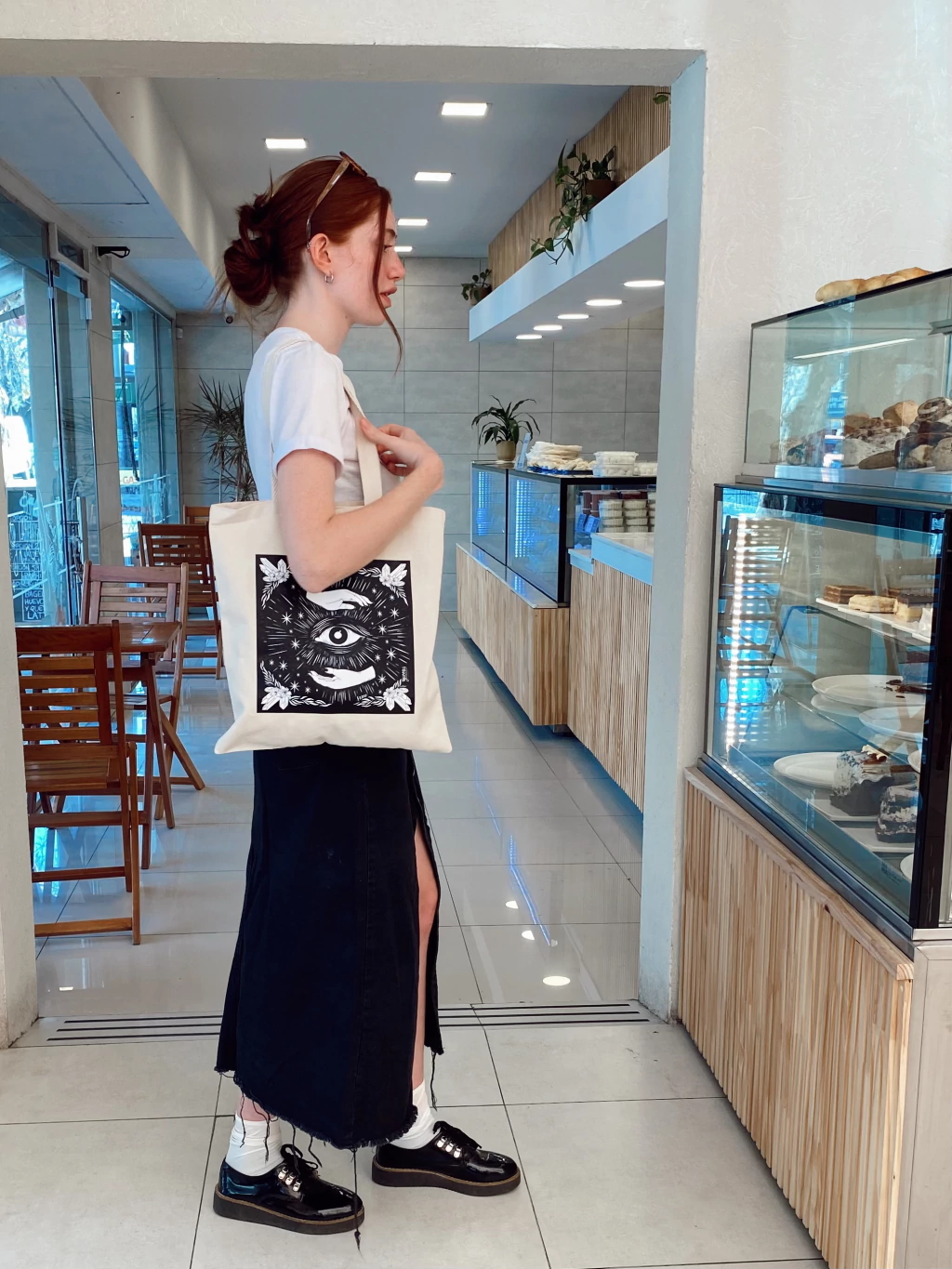 Esta ilustración realizada exclusivamente por Brenda Frank para Zuccas , fue pensada como un amuleto protector ambulante 🧿 En un color que va con todo, Brenda combinó cristales, manos y estrellas rodeando un ojo infinito que todo lo ve 🙌🏻
